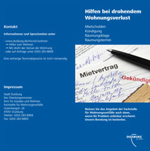 Die beliebte Broschüre "Wohnen und Leben in Duisburg" ist kostenlos in allen Wohnungsämtern und Bürger Service Stationen der Bezirksämter erhältlich. Auf 40 Seiten erhalten die Leser einen kompakten Überblick über einige Wohnungsanbieter und wohnungsnahe Dienstleister in Duisburg. In einem Kurzportrait geben die Unternehmen einen Überblick über Wohnungsbestände, Dienstleistungen und Ansprechpartner. Zudem enthält die Broschüre Hinweise zu Leistungen des Amtes für Soziales und Wohnen.